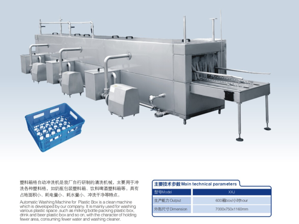 Automatic Washing Machine for Plastic Box is a clean machine which is developed by our company. It is mainly used for washing various plastic space ,such as milking bottle packing plastic box, drink and beer plastic box and so on, with the character of holding fewer area, consuming fewer water and washing cleaner.
